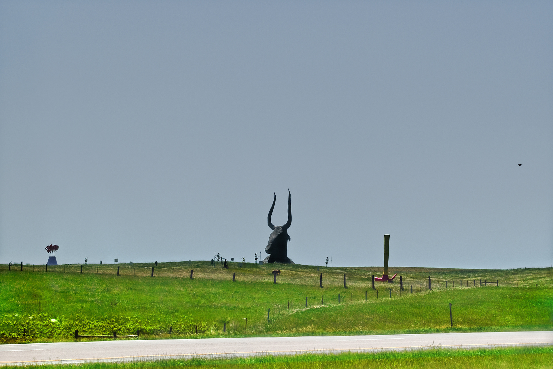 드넓은 초원 지평선에 고개를 내민 거대한 동물. 뭐지? 구름낀 하늘 아래 매끄럽고 낮게 뻗어 있는 능선에 경비병처럼 서 있는 젖소 한 마리. 왜 저렇게 커? 그것들이 조각이라는 생각에 앞서 그 광경의 비현실적인 비율에 더 관심이 갔던 것은 작가의 예술적 동심에 기인한다.