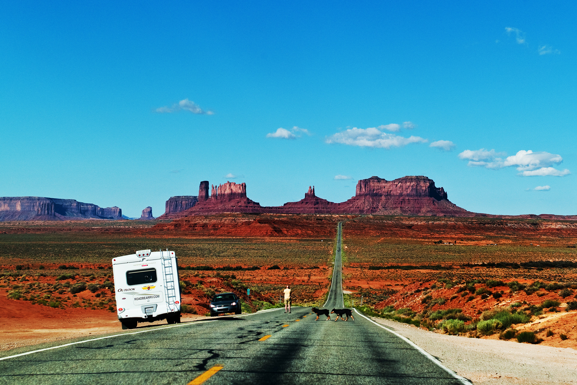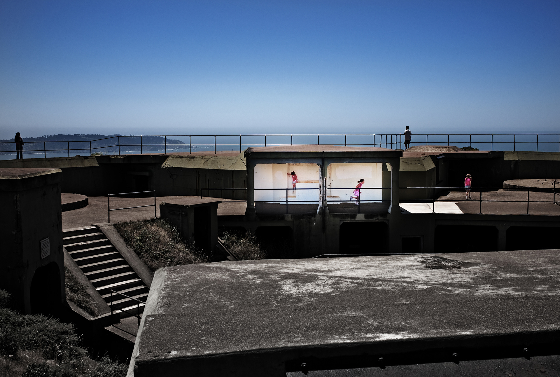 Strolling people with The Alcatraz island in the background and a bird in the sky, two dogs from nowhere on the isolated freeways, particularly small chapel on the boardwalk, a traveler on the cliff against the sea are the examples of the fictional sceneries that Lee is pulling off while carrying out traditional photographic functions. It seems like that Lee is trying to emphasize that ‘surreal’ or ‘illogical’ sceneries can be found in the reality which normally expected to be seen in dreams. Actually there are many relationships that are not seen very ‘realistic,’ but they are not noticed or troubled by problems because those relationships are undeniably ‘reality.’ It is totally Lee’s artistic interests that made the ‘strange,’ ‘unexpected,’ and ‘surrealistic’ sceneries approachable. Not only had the relationships of the motives but also the colors of background exposed Lee’s ‘surrealistic’ in his works. ‘Strangeness,’ ‘otherness,’ and ‘surrealistic’ are the values of Lee’s work that are connected from his first work.